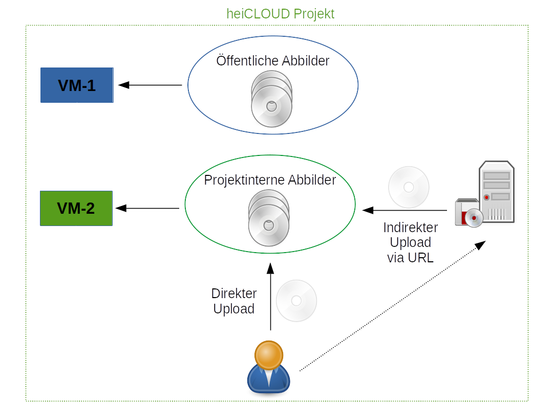 Zusätzlich zu den öffentlich bereitgestellten Abbildern verfügt jeder Nutzer über die Möglichkeit, eigene Images (direkt oder indirekt via URL) hochzuladen und zu verwenden. Die meisten Linux-Distributionen bieten bereits vorgefertigte Cloud-Images in verschiedenen Variationen an. Es besteht jedoch auch die Möglichkeit, eigene Abbilder manuell zu erstellen.