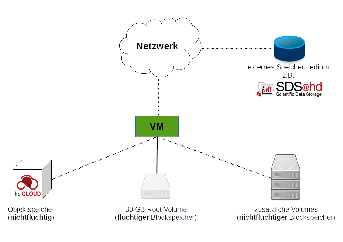 In heiCLOUD ist ein Block- und ein Objektspeicher verfügbar. Jede Instanz (Ausnahme: Windows